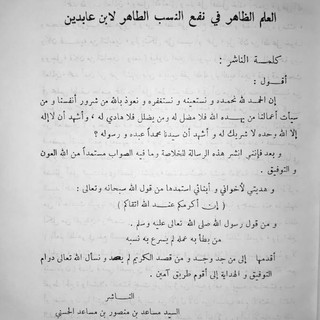 (( العلم الظاهر في نفع النسب الطاهر )) للإمام العالم العلامة السيد محمد امين الشهير بابن عابدين. وهي من الرسائل الثمينة والتي تحث اصحاب النسب الطاهر على الامتثال بمنهج وسلوك جدهم رسول الله صل الله عليه وسلم قولا وفعلا وان يكونوا قدوة يقتدى بهم في الحياة وكذلك، بيان نفع أصحاب النسب الطاهر بال بيته ولابد من ان يعرف الناس مقدار هم ونفع ال البيت وحبهم يعتبر واجب ومن الايمان وقد جعلها الوالد في كتيب من ثمان ورقات ليسهل قراءتها ونشرها بين الناس و ابناء العترة الطاهرة. وقد تم طباعتها بمطابع الرشيد للطباعة والنشر بالمدينة المنورة.